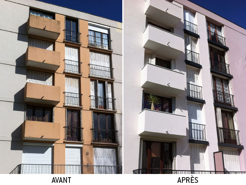 Isolation thermique par l’extérieur sur façades courbes avec reproduction des engravures décoratives, sols en résine coulée.